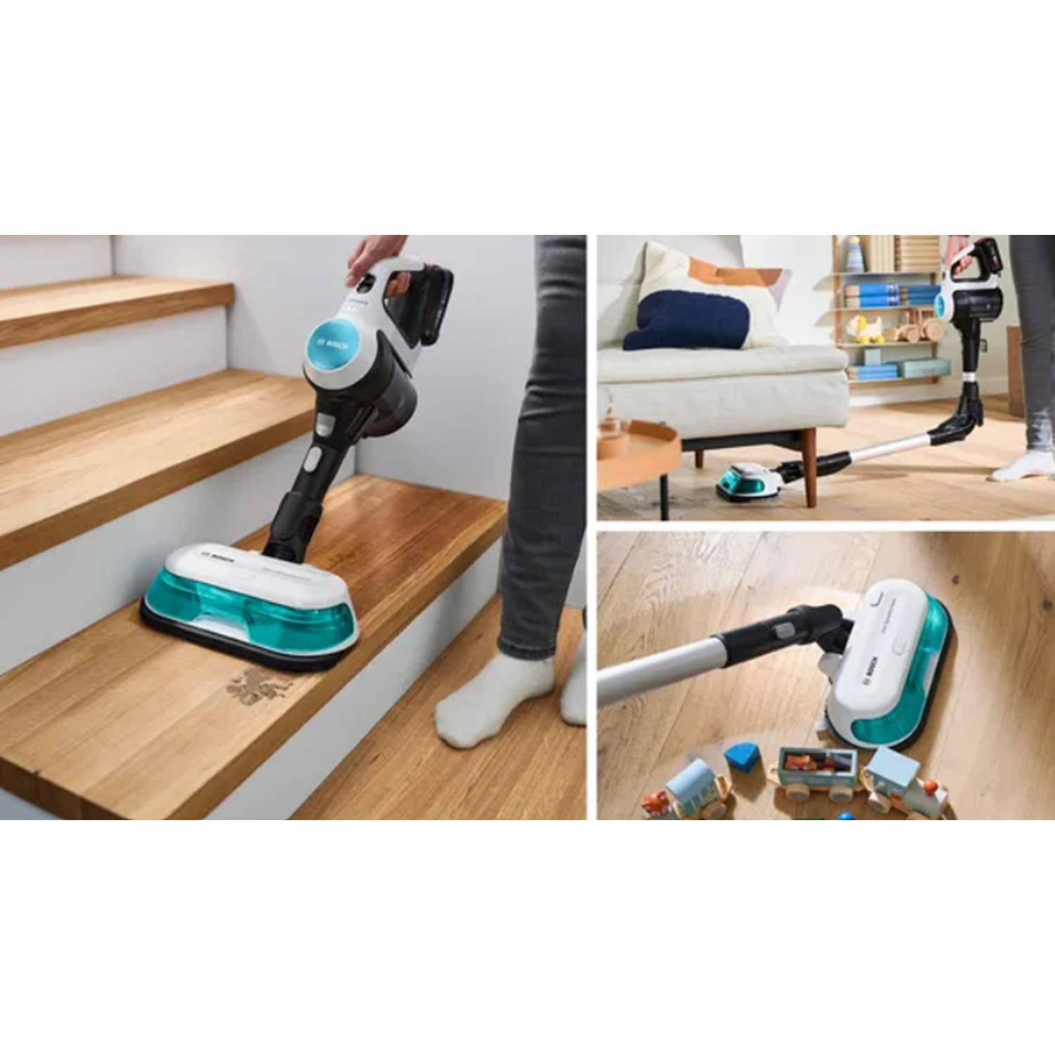 İyi bir dikey süpürge ve mop kombinasyonu her türlü sert zemindeki tozu toplamak ve lekeleri temizlemek için yeterlidir. Unlimited 7 ProHygienic Aqua tam da bu yeteneklere sahiptir. Bosch'un güçlü TurboSpin Motoru, yüksek çekiş gücü ve etkili silme için otomatik dönen pedleriyle banyodan mutfağa kadar her türlü kiri ve lekeyi temizlemeye hazırdır.