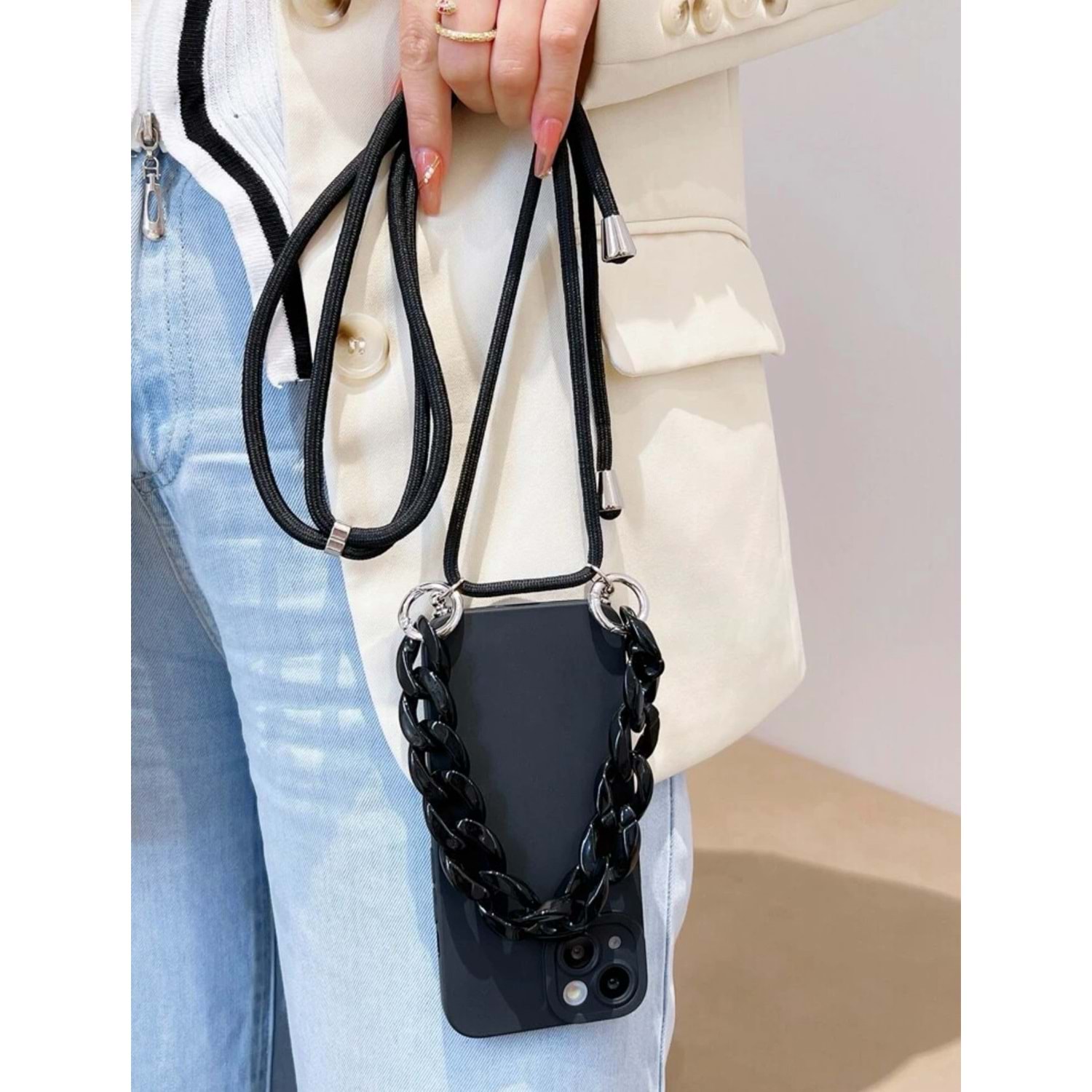 SİYAH İP VE ZİNCİRLİ LENS KORUMALI IPHONE 15 PROMAX KILIF